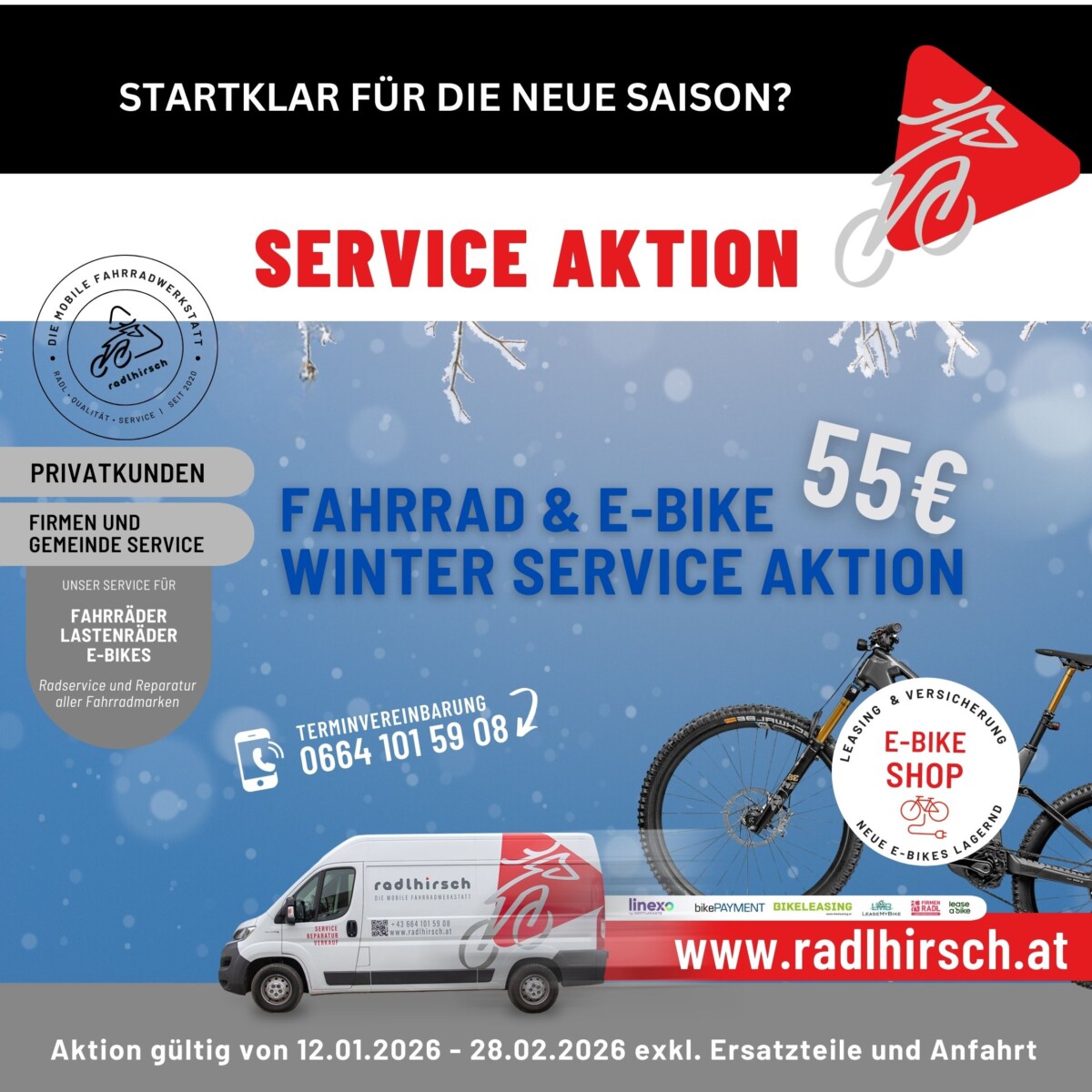 Der Winter ist die perfekte Zeit, um dein Fahrrad oder E-Bike fit für die nächste Saison zu machen. Mit der Radlhirsch Winter-Service-Aktion sorgst du jetzt vor – professionell, zuverlässig und bequem bei dir vor Ort.